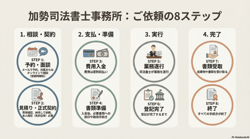 当事務所にて、あるいはオンライン(Google Meet)で面談を行い、詳しいお話をお伺いいたします。