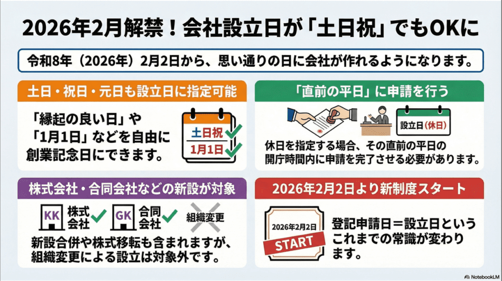 商業登記規則の一部改正により、会社設立の登記申請において、行政機関の休日(土日・祝日・年末年始)を設立日として指定できる特例が設けられました。