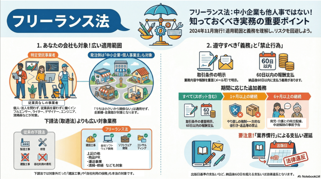 特に、下請法(取適法)の適用経験がない中小企業や個人事業主は要注意です。フリーランス法は大企業だけでなく、広範な事業者が対象となり得ます。