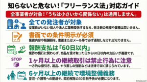 フリーランス法は、発注者側の規模を問いません。中小企業でも、個人事業主でも、フリーランスへの業務委託があれば適用対象となります。この点、よく似た義務を定める取適法(旧下請法)とは異なります。