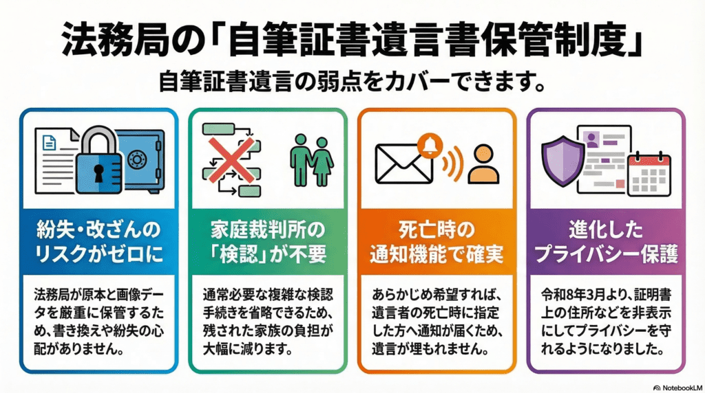 こうした弱点を補うために設けられたのが、法務局による保管制度です。
