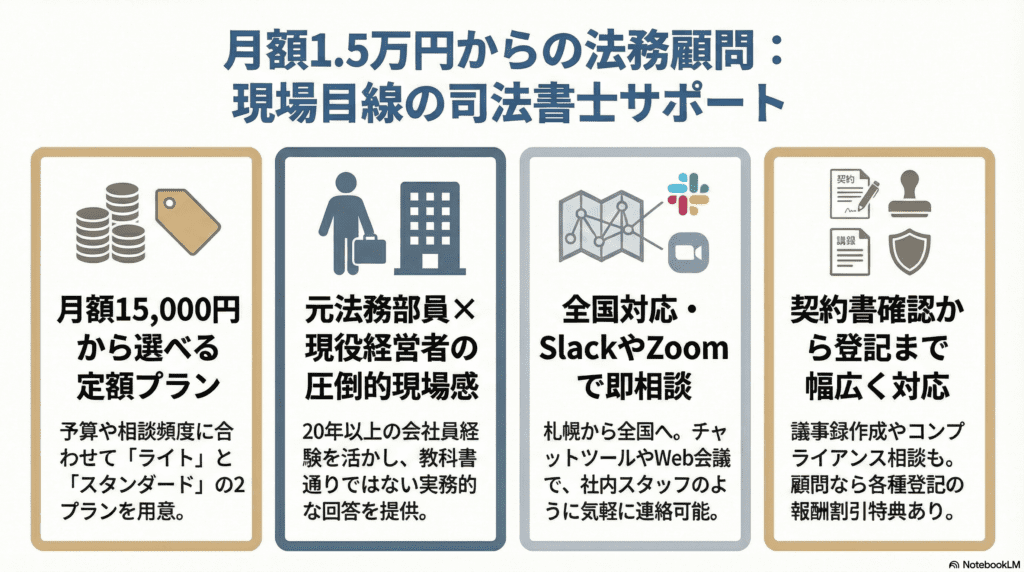 月額定額で、法務に関するご相談や書類のチェックなどを継続的にお受けするサービスです。「契約書を確認してほしい」「議事録の書き方がわからない」「この手続きはどうすればいい?」といった日常的な法務の疑問に、気軽にご相談いただけます。