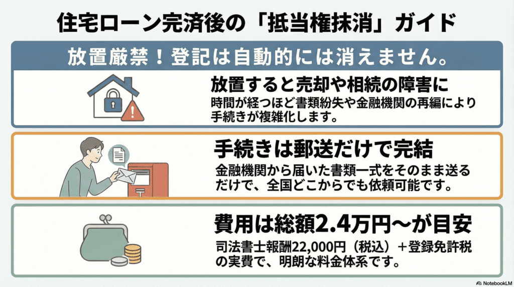 登記は自動的には消えません。放置しても罰則はありませんが、将来ご自宅を売却したり、相続が発生した際に手続の障害となることがあります。また、受け取った書類を紛失したり、金融機関の合併・再編が起きると、手続がより複雑になります。
