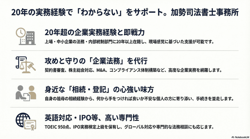 「法務手続まで手がまわらない」「自社ではどのようなことが必要なのか確認したい」という企業の方のご相談にも、経験者として実践的に対応させていただきます。