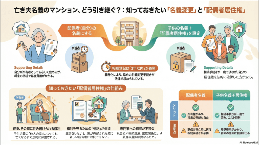 「夫が亡くなり、マンションの名義を私にするか子供にするか迷っている。知り合いに相談したら色々言われて、かえって混乱してしまって…」